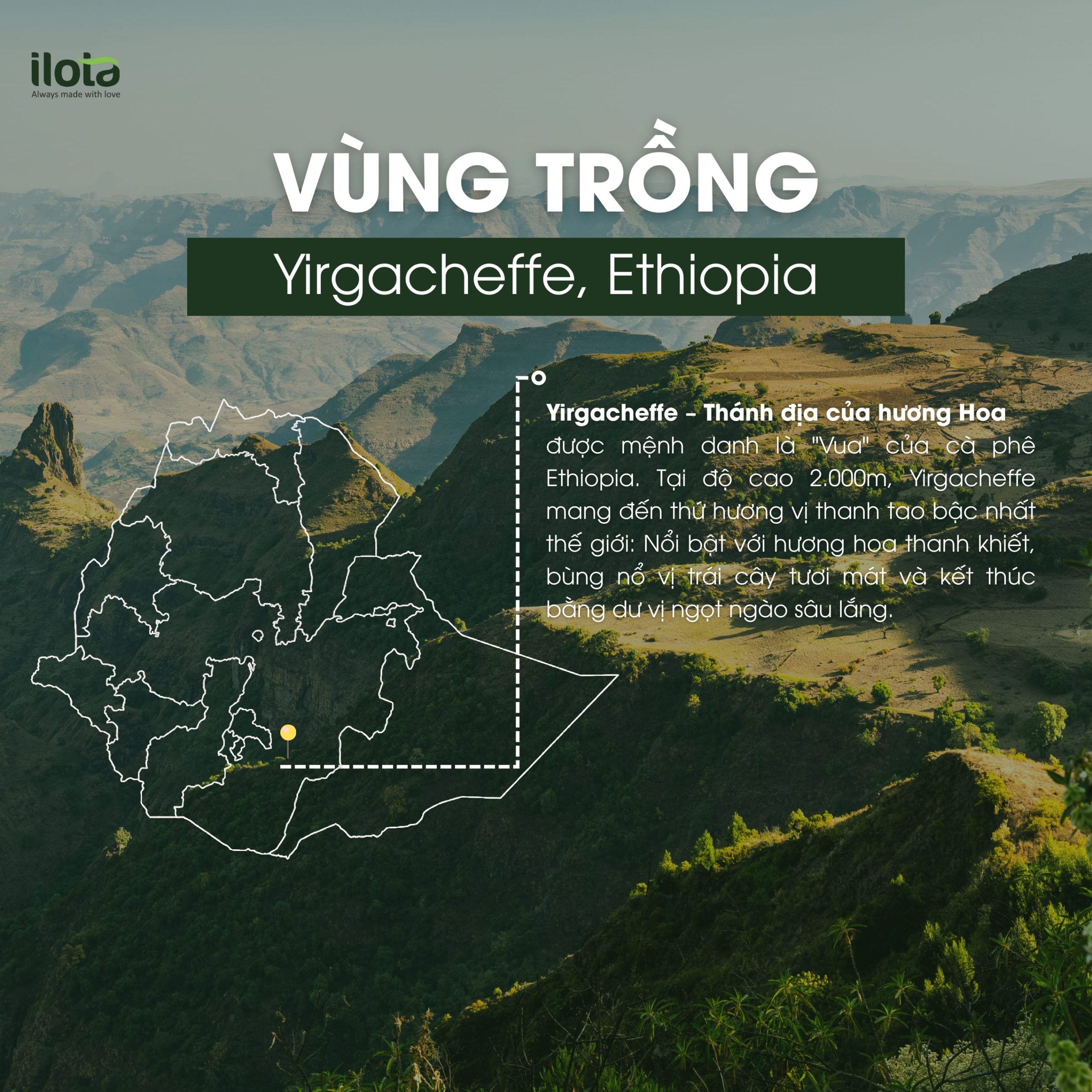 Vùng trồng: Được trồng ở vùng Yirgacheffe, thuộc miền Nam Ethiopia và bao gồm 1 số khu vực khác gọi là Woredas. Vùng trồng Arabica Ethiopia được trải rộng trên vùng cao nguyên màu mỡ phía nam hồ Awasa ở trong Thung lũng Rift có độ cao giao động từ 1.800m – 2.200m so với mặt nước biển